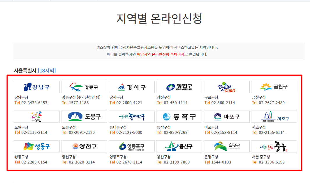 거주하고 있는 지자체 뿐만 아니라, 자신이 자주 주차를 하고있는 지역을 선택해서 신청을 해주시면됩니다. 서울에는 약 18개의 지역의 서비스를 제공하고 있습니다.