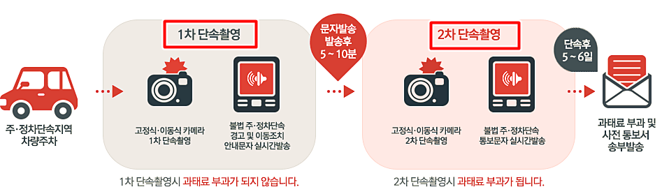 주정차 단속지역에서 차량을 정차 또는 주차하게 될시 이동식 고정 카메라가 촬영을 하며, 이 촬영한 사실을 주차단속 알림서비스에 신청한 사람에게 문자로 알림이 가게되는 것입니다.