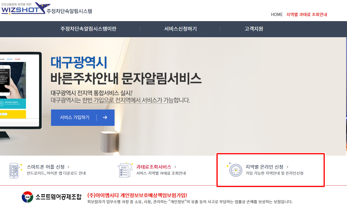 주정차단속 알림시스템에서 지역별 온라인 신청을 클릭해주시고 알림을 받고자하는 지차체를 선택해주시면 됩니다.