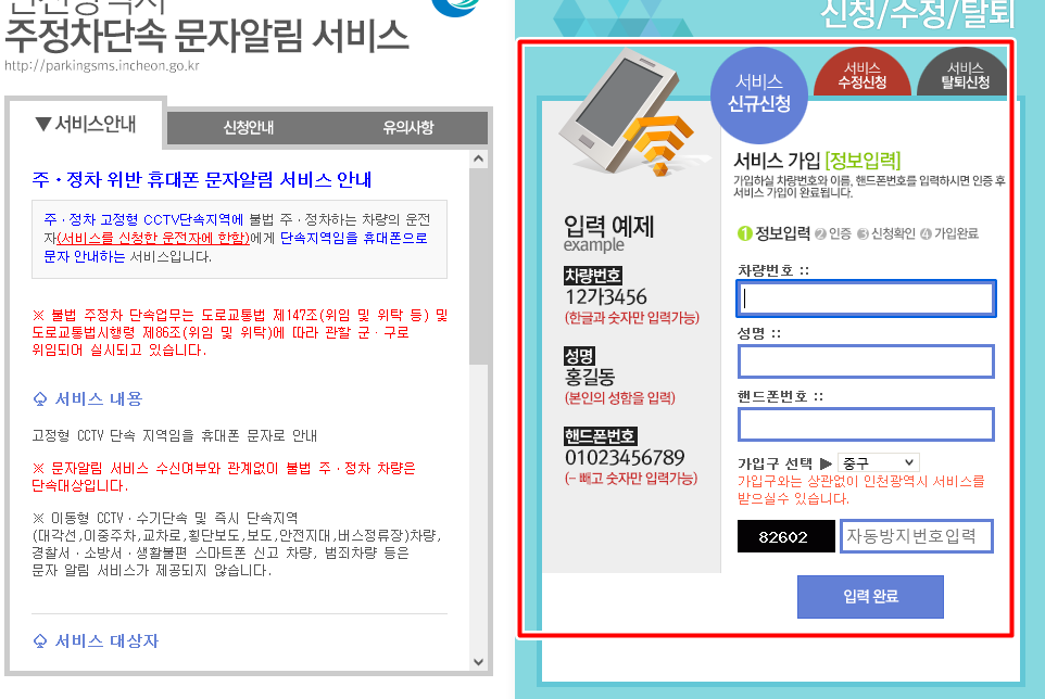 -휴대폰 번호 등등 개인정보 변경시에 각 시·군·구의 주정차 단속 알림서비스 홈페이지에서 서비스 수정신청을 반드시 해야지만 서비스를 계속 이용할 수 있습니다.